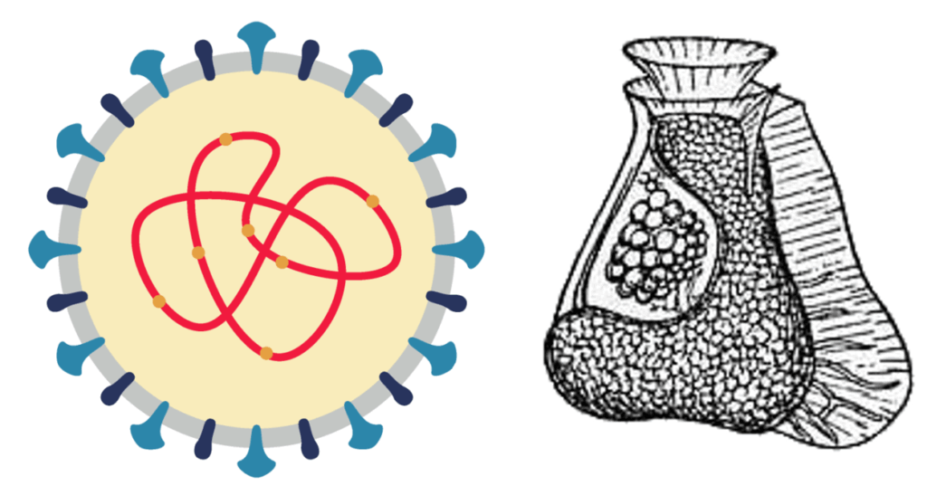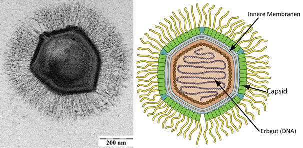 Abb. 1 Mimivirus unter dem Elektronenmikroskop (links) und in schematischer Darstellung (rechts). (Links: Ghigo E, Kartenbeck J, Lien P, Pelkmans L, Capo C, Mege JL, Raoult D. – http://www.plospathogens.org/article/info%3Adoi%2F10.1371%2Fjournal.ppat.1000087 PLoS Pathog. 2008 Jun 13;4(6):e1000087. doi: 10.1371/journal.ppat.1000087, CC BY 2.5; und rechts nach: ViralZone, SIB Swiss Institute of Bioinformatics: https://viralzone.expasy.org – VIRION at https://viralzone.expasy.org/580 Mimivirus, CC BY 4.0; jeweils Wikimedia)