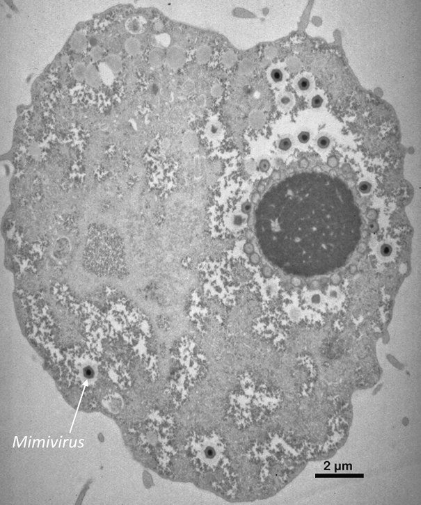 Im Jahr 2003 entdeckten Wissenschaftler ein merkwürdiges Gebilde in einer Wasserprobe, das sie als Mimivirus bezeichneten. Der Fund war allerdings riesig für ein Virus – etwa 750 Nanometer breit, groß genug, um unter einem normalen Mikroskop gesehen zu werden (ein Nanometer ist ein Millionstel eines Millimeters). Zunächst hielt man es für ein Bakterium, weil es sich unter dem Mikroskop mittels eines für Bakterien typischen Farbtestes verfärbte (Raoult 2004). Mimivirus infiziert Amöben, das sind einzellige Lebewesen, die oft im Boden oder Wasser vorkommen. Sein Erbgut (Genom) ist für ein Virus massiv – 1,2 Millionen Basenpaare mit über 900 Genen, die wie Rezepte zur Herstellung von Proteinen sind (Raoult 2004). Man kann sich Basenpaare als Buchstaben in der DNA-Bauanleitung vorstellen. Das ist bemerkenswert, da einige Bakterien ähnliche Genomgrößen haben.