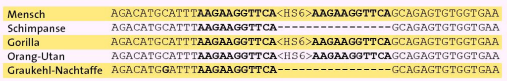 Abb. 5 Das genetische Alu-Element HS6 ist beim Menschen, Gorilla und Orang-Utan vorhanden, nicht aber beim Schimpansen und Graukehl-Nachtaffen. Es gibt auch keinen Hinweis darauf, dass an dieser Stelle im Schimpansengenom jemals ein Alu HS6 vorhanden war. Diese Ergebnisse legen nahe, dass die Integration und Exzision (Ausschneiden) dieser genetischen Elemente sehr präzise erfolgt. (Nach Hedges et al. 1999)