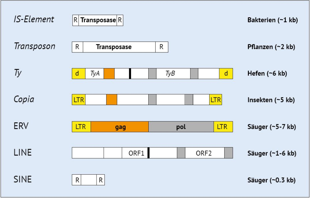 In den komplexeren Eukaryonten* sind ebenfalls mehrere Klassen mobiler genetischer Elemente nachgewiesen worden, die als VIGE eingestuft werden können. In der Literatur werden sie heute als transponierbare und transponierte Elemente (kurz: TE*) bezeichnet. Es gibt einfache DNA-Transposons, die den IS-Elementen von Bakterien ähneln, jedoch auch komplexere Retrotransposons* wie die longinterspersednuclearelements (LINE*) und die endogenen Retroviren (ERV*). Sie verfügen über mehr Gene, die sie für ihren Copy-Paste-Mechanismus der genomischen Transposition benötigen. In den Hefen sind die bekanntesten Transposons die Ty-Elemente, in den Insekten sind es die Copia-, Gypsy- und P-Elemente. Und in den Pflanzen beobachtet man die Cin- und Mu-Elemente. Tatsache ist, dass alle Genome unzählige Kopien von TE (VIGE) enthalten. Diese Elemente wurden wie die Transposons lange Zeit als Junk-DNA betrachtet.