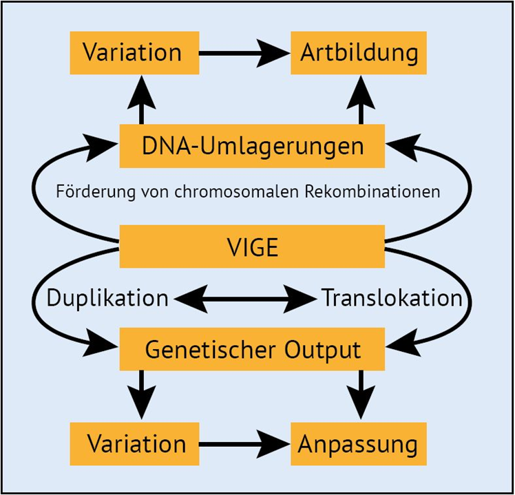 In der Biologie muss heute bezüglich der Quellen für Variabilität umgedacht werden: Vererbbare Variation ist größtenteils nicht „eine Folge des Zufalls“, sondern auf TE (VIGE) zurückzuführen, die in allen erforschten Genomen reichlich vorhanden sind. Nicht nur Variation, sondern auch Anpassungen und sogar Artbildung gehen demnach maßgeblich auf im Genom vorhandene Elemente und entsprechende (programmierte) Mechanismen zurück (Abb. 6). Aufgrund ihres redundanten Charakters (es gibt Tausende von ihnen) wurden TE oft voreilig als funktionslos abgetan. Es wurde argumentiert, dass es so viele von ihnen gäbe, dass bei Weitem nicht alle eine Funktion haben könnten. Doch sollte bedacht werden, dass die Erzeugung von Variation in den Nachkommen eine Eigenschaft ist, ein funktionales Merkmal, das diffus über das gesamte Genom verteilt ist – und als solches war es sehr schwer zu lokalisieren.